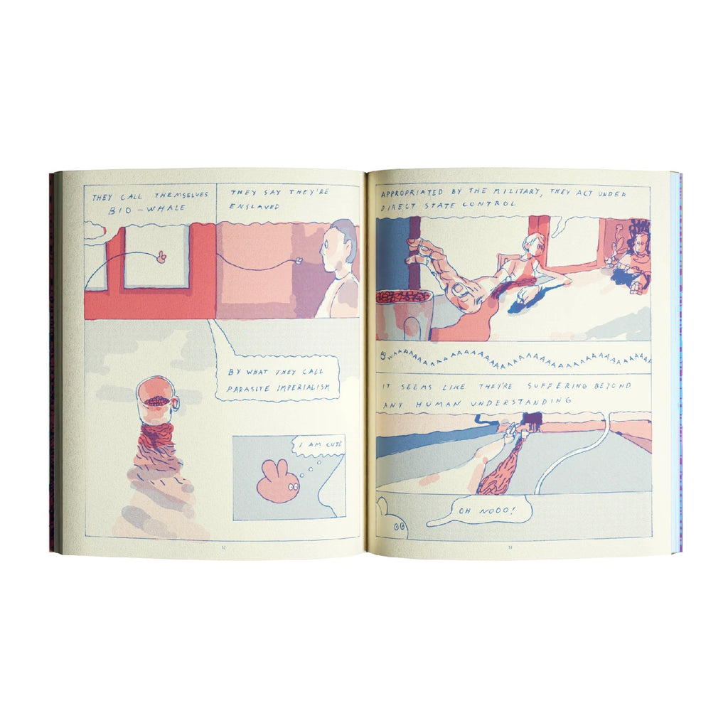 A kid who dreams about “Bio-Whale”, an online conspiracy forum poster, and a military weapons pilot all become intertwined under the influence of the secret military hyperweapon that goes haywire over 118 blue and pink pages.