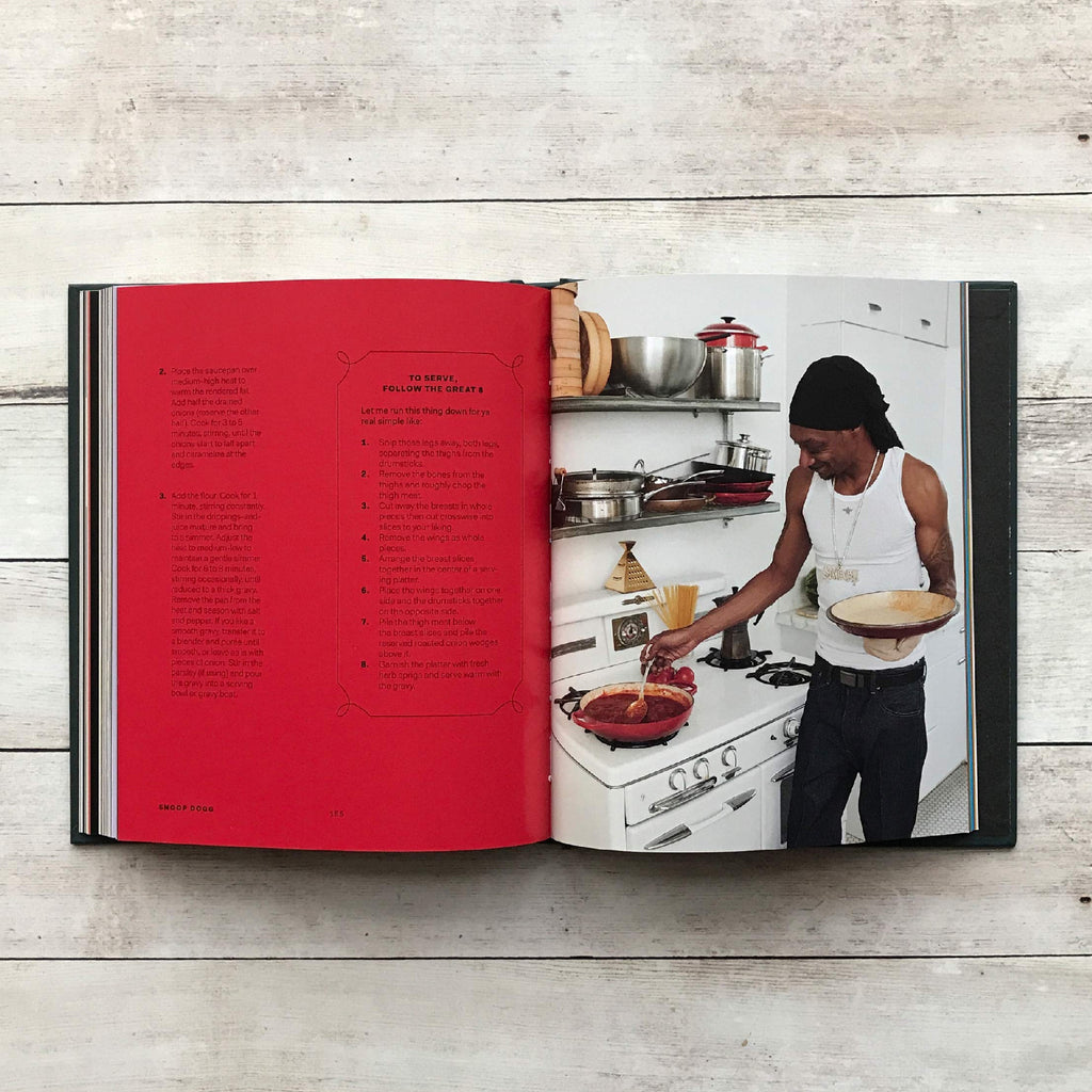 Recipe book that delivers 50 recipes straight from Snoop's own collection: Snoop's cookbook features OG soul food cookbook staples like Baked Mac & Cheese and Fried Bologna Sandwiches with Chips, and new takes on classic weeknight faves like Soft Flour Tacos and Easy Orange Chicken. And it don't stop...Snoop's giving a taste of the high life with remixes on upper echelon fare such as Lobster Thermidor and Filet Mignon. But we gotta keep it G with those favorite munchies too, ya know? From chewy Starbursts to those glorious Frito BBQ Twists, you should have an arsenal of snacks that'll satisfy. And of course, no party is complete without that Gin and Juice and other platinum ways to entertain.
